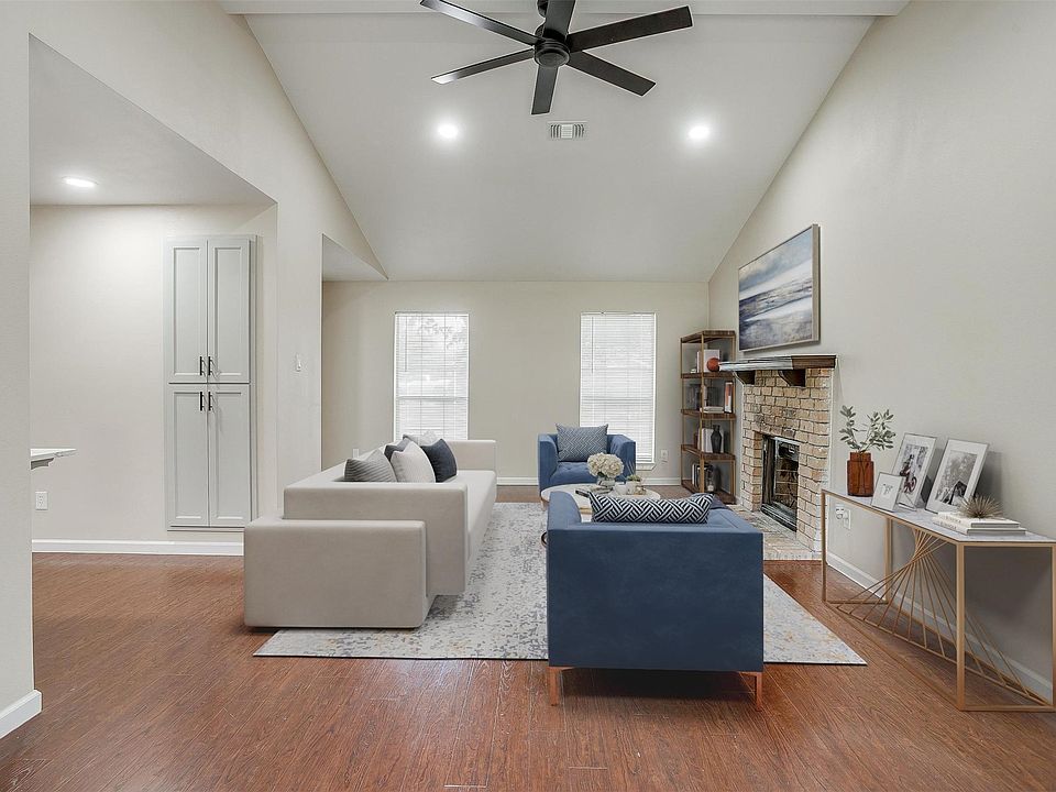 Wood-burning fireplaceModern finishesVaulted ceilingsNewly installed canned lightsCustom cabinetryStylish porcelain tile