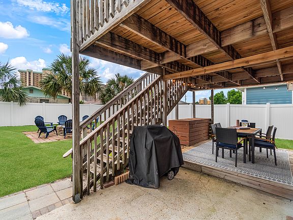 This beautiful single story Panama City Beach home boasts 3 bedrooms, 2 bathrooms, a fully remodeled & outfitted kitchen, and a living room with tons of seating. The exterior has an outdoor dining space, a large fully fenced backyard, a fire pit, and a private roof top sundeck with an incredible views. There is ample parking for your vehicles (easily fit 4 vehicles), and room for your RV or boats (up to 34 ft) on the uncovered portion of the driveway. Walk to the beach in 7 minutes and enjoy!