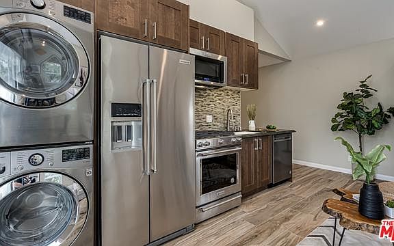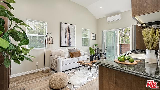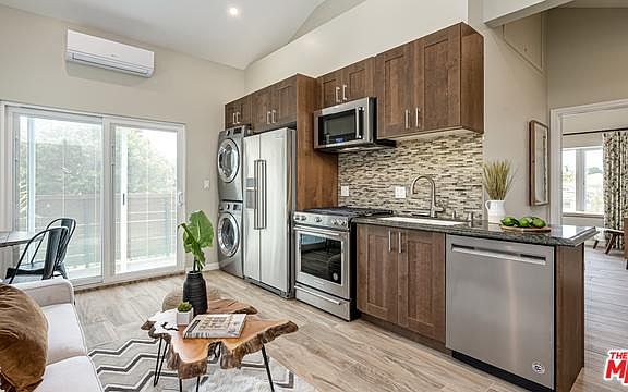 New construction, private 1 bedroom has vaulted ceilings and a private balcony. On a quiet residential street in Westchester, a half mile from the 405, 2 miles to LAX. Unit is located upstairs in the rear of the property with entry gate (accessible by phone or key pad). Kitchen has granite countertops, full-size, high-end stainless appliances: gas range, oven, convection/microwave, in-unit washer and dryer, and a moveable island counter on castors. A beautiful bedroom bay window overlooks trees and the street. Full bath has a stunning tile shower and onyx counters. A/C and heating.