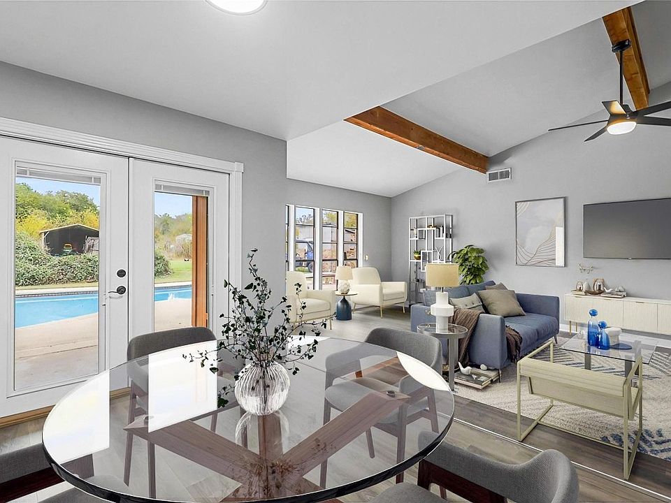 Looking for country life but want to be close to it all? You have found it! Situated on 2.67 acres! This home has recently been totally remodeled with beautiful grays & white decor ready for move in! Beautiful open living area with wood burning stove & windows overlooking the sparkling diving pool. Kitchen features a breakfast bar & island perfect for gatherings. Lots of light and bright areas for the chef! Coffee bar-wet bar just off kitchen adds to the entertaining possibilities. Primary is large and features a walk in shower, dual sinks,gorgeous dual barn doors with walk in closet! Out back is your very own private oasis ready for your imagination. Several storage buildings, 4 stall building perfect for a business or storage. 490 sq ft tiny home perfect for multi generational living complete with electric & water- just needs septic to complete for living! Maybe have a homestead farm with chickens or cut a path from 802 thru the property to have a home business with separate entry!