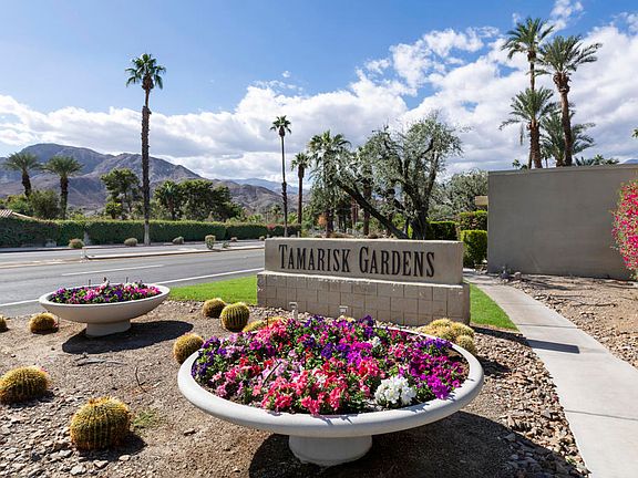 This stunning, light filled condo available at the highly desirable Tamarisk Gardens is waiting for you! 1 of only 28 condominium homes, built in 1966 and designed by architects McCarthy and Hartfelder, it is located adjacent to and steps away from the Tamarisk Country Club. The open, light filled floor plan consists of a large living room with a 2-way gas fireplace, and formal dining area which opens to a private patio. The updated chef's kitchen includes top-of-the-line Wolf, SubZero and Bosch appliances. There is an informal dining area off the kitchen as well as a breakfast bar to allow for plenty of entertaining. There are two main suites, each with a generous walk-in closet, plus a large den/office. Each of the two baths have been updated. The home opens onto private, south facing patio with mountain views and has loveling evening lighting. The home also offers plenty of upgraded interior lighting and ceiling fixtures to create the perfect mood for evening entertainment. There is also leased solar with favorable rates, and electric window coverings. Assigned carport and an additional dedicated parking space is included. The grounds are impeccably maintained, with a community pool and spa which are steps from this home. Some of the furniture could available outside of escrow. Buyers and their agents are to conduct thorough investigates regarding the property and verify any information regarding this property.