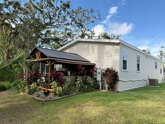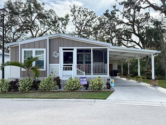 Step Into Your Own Florida Jungle Retreat in The Oaks! Step into the most jungle like Florida landscape, alive with wildlife and wrapped in the comfort of a resort style gated community. This is a true showstopper home in The Oaks of Colony Cove: 7017 Zander Court, Ellenton, FL. Welcome to a stunning 2020 three bedroom, two-bath home located in the gated section of The Oaks. Positioned on a beautiful corner style lot with no neighbor on one side and a peaceful nature and wildlife preserve behind it, this home provides exceptional privacy and the feeling of a true Florida sanctuary, where daily visits from birds, butterflies, and other wildlife enhance the natural beauty surrounding the property. A long driveway and spacious carport offer ample parking for multiple vehicles as well as a golf cart. The screened in front porch, designed with vaulted ceilings, creates a warm and welcoming entry into the home. This front porch is one of three screened outdoor living areas, each providing a unique way to enjoy the lush, tropical environment year round. Inside, an etched glass front door opens into an airy, open-concept living space filled with natural light. The home features vinyl plank flooring throughout, vaulted ceilings, and crown molding, including detailed trim above the cabinetry and windows. The kitchen serves as a focal point with its oversized island, abundant counter space, beautifully finished cabinetry, and charming design details that elevate the appeal of the space. The bedroom layout is thoughtfully designed for comfort and privacy. The first guest bedroom, currently used as an office, includes a barn door leading to a walk in closet. The second guest bedroom easily accommodates a queen bed along with additional furniture. The guest bathroom offers a shower tub combination, an upgraded vanity with storage drawers, and a separate linen area, providing both function and style. The primary suite is generously sized and includes a king size bed that will remain with the home. Vaulted ceilings and a barn door closet with custom built ins bring a combination of style and organization to the room. The en suite bathroom features dual sinks, a large vanity with added drawer space, a ceramic tiled walk in shower, and ample storage, creating a peaceful and comfortable retreat. The interior laundry room is equipped with a washer and dryer, a built in utility storage door, and a doggy door for pet owners. From this space, you can access the carport area, where additional storage and a second refrigerator are located. One of the most impressive features of this home is the rear screened in retreat overlooking the serene wildlife preserve. This outdoor living space includes a concrete pad, built-in kitchenette, and plenty of room for entertaining or relaxing. Nearly all items in the outdoor kitchen area, including the Blackstone, will remain with the home, making it move-in ready for seamless outdoor living. Living in the Oaks section of Colony Cove offers the security and privacy of a gated area with its own pool, while still providing access to the full array of amenities available within Colony Cove. Residents enjoy six pools, a marina, boat docks, a fishing pier, a pavilion, a dog park and more plus a vibrant calendar of activities and events throughout the year. The community is pet friendly and allows two dogs up to 75 pounds each. This home is a rare combination of privacy, modern comfort, wildlife immersion, and the very best of Florida living. Lot rent in Colony Cove varies depending on the location of the home within the community. This monthly fee includes not only access to the extensive list of amenities but also covers many of your routine living expenses. Water, sewer, trash pickup, property taxes, and lawn care are all included, leaving you responsible primarily for electricity and inte