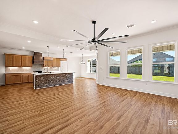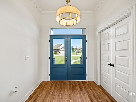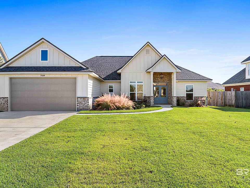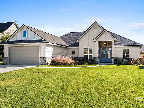 Located in the gated community of Stonegate Estates, 7018 Rocky Road Loop puts you between Foley and the beach with community amenities including scenic ponds, a clubhouse, pool, and basketball and tennis courts. You’ll love being just minutes from schools, shopping, dining, and quick access to both Hwy 59 and the Foley Beach Express. Custom built in 2025 by Cretin Townsend Homes, this move-in ready 4-bedroom, 2.5-bath home offers 2,127 square feet of beautifully designed living space filled with custom finishes. Inside you’re greeted by 9-foot base ceilings throughout, crown molding, and beautiful quartz countertops that carry through the home, along with a spacious great room featuring a 10-foot ceiling and LVP flooring. The kitchen is a showstopper with stainless steel appliances, Tidwell cabinets, tile backsplash, farmhouse sink, custom vent hood, under-cabinet lighting, and a brick-accented island with seating. A walk-in pantry with built-in shelving and its own sink adds convenience. The dining area sits just off the kitchen, making family meals effortless. The primary suite has a tray ceiling and a stunning ensuite bathroom featuring ceramic tile flooring, a custom-tiled shower, soaking tub with tile surround, dual vanities, and a spacious walk-in closet with built-ins and a chandelier. Three additional bedrooms share a full bathroom, and a stylish half bath is perfect for guests. A dedicated mudroom with patterned tile welcomes you in from the attached double garage and flows seamlessly into the laundry room. Step outside to enjoy a covered back porch with an extended patio overlooking the fully fenced backyard. Seller will provide $5,000 credit toward buyer's closing costs or interest rate buy-down contingent upon buyer's use of seller's preferred lender. Buyer to verify all information during due diligence.