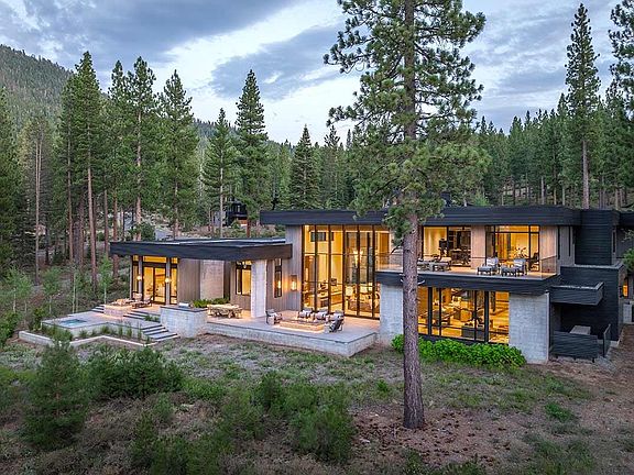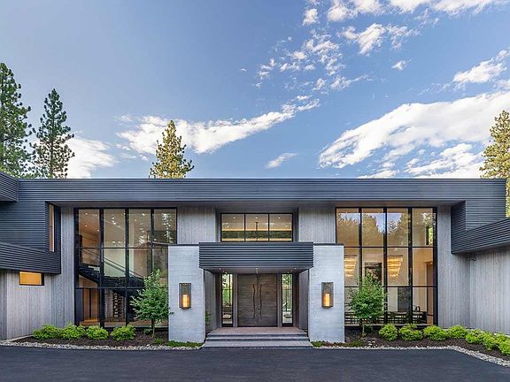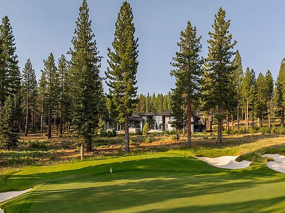 While there’s much competing for your eyes here, there’s no avoiding the magnetism of that stretch of fairway that arrives at the green just beyond your back patio. Aside from this rare, elevated, full-length view of the 13th hole of Tom Fazio’s Championship Golf Course, there’s also a view of the 14th hole and the Carson Range beyond. And then those attention spans become even more challenged as the wonders of this 9,000 square foot mountain modern Martis Camp estate continue to unfold, starting from the first step into this home where the great room’s tall ceilings frame immense views and an abundance of sky. Glance left, beyond the great room’s double-sided fireplace, and you’re immediately drawn to a stunning, glassed-in wine vault that can hold up to 1,200 bottles. The vault is a work of art, adjacent to a full bar and a game room with a large wall of tvs, ping pong table, and access to a back patio with hot tub, two firepits, a barbecue bay and covered/heated dining, and those ever present views of the golf course just a 9 iron away. Down the hall and behind double doors is the next element of surprise: a spacious big-screen theater with eight custom seats and outstanding audio. Not to be outdone is a garage bay that’s been converted into a driving range simulator with gallery seating. The opposite wing of this 5 bedroom, 5 full and 2 half bathroom home is where you’ll find an impressively modern kitchen with pantry, a lengthy custom dining table of glass and wood, a pair of bedrooms, and – beyond the glass sauna, a primary suite with large fireplace, tv, bathroom with vast double-headed shower, views of the 13th green, and immediate access to the hot tub on the patio. The glass and metal staircase near the entry climbs to a floor where you'll find more astonishment in the form of a gym with access to a deck with elevated view to the golf course, and a spacious office which also accesses that deck. There’s also a bunkroom up here with views of Lookout Mountain, and an additional bedroom. A short drive from the ski lodge and with those exceptional, intoxicating views of the golf course, this estate stands out as a rare opportunity to come home to that place Barron’s referred to as, “the best place to own a second home in Tahoe.”