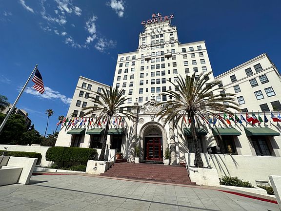 Situated on the 10th floor of the El Cortez, this 1-bedroom, 1-bath unit features beautiful hardwood flooring, striking mid-century modern furnishings, a kitchen with granite countertops and stainless-steel appliances, as well as elegant cabinetry. The generously spaced layout welcomes you with an abundance of natural light, streaming in through ample windows that frame the city skyline.