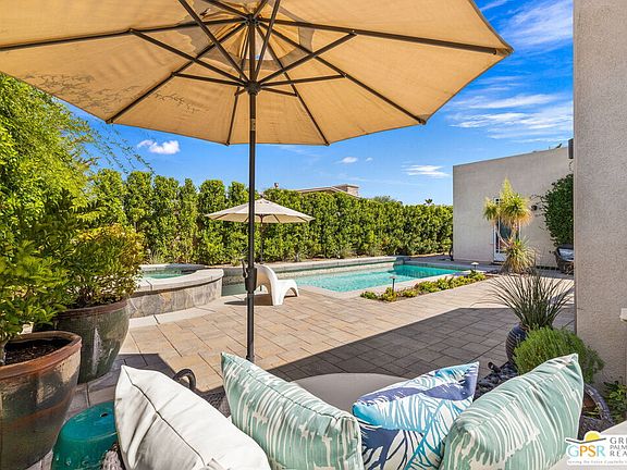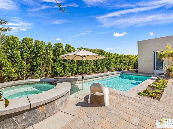 Stylish, spacious, and private! Welcome to 702 Axis Way at Escena Golf Club! Located on a premier corner lot, this home blends clean architectural lines, modern finishes, and resort-style living in one of Palm Springs' most desirable gated golf communities: Escena Golf Club! Inside this gated Nicklaus-designed championship course, residents enjoy scenic walking and biking trails, community dog parks, and the popular Escena Grill, a mid-century modern-inspired clubhouse restaurant with panoramic mountain views. Formal living and dining areas showcase tall ceilings, floor-to-ceiling windows, a sleek gas fireplace, and seamless access to the ultra-private backyard complete with pool, spa, and mature fichus hedging that frames the outdoor oasis in total seclusion. A separate great room centers around a light and bright kitchen with clerestory windows, built-in appliance suite, detached island, and upgraded cabinetry with custom drawer systems. The kitchen opens to a comfortable family room anchored by a second gas fireplace ideal for everyday living and effortless entertaining. A spacious pantry and direct access to the attached two-car garage add everyday convenience. Primary Ensuite, with direct access to the pool and spa, offers a true retreat featuring dual sinks, an extended walk-in shower, separate soaking tub, and a generous walk-in closet. Bedrooms Two and Three are positioned on the opposite wing of the home, each with views of Mt. San Jacinto and easy access to a full hallway bath with dual sinks and walk-in shower. A separate powder room serves guests with style and ease. Additional highlights include tile flooring throughout, custom 4.5" wood shutters, LED recessed lighting, upgraded pool decking, and colorful exterior landscape lighting. Paid for and owned solar panels and thoughtful outdoor enhancements like extended concrete pathways, white and iceberg roses, red yucca, and lemon and lime trees . Discover the perfect blend of elegance, privacy, and lifestyle all in the heart of Palm Springs.