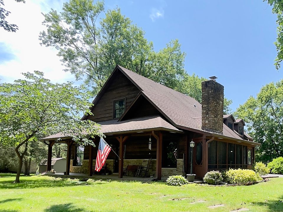 Cedar & stone chalet in Avon on almost an acre. Huge, covered porch, a screened in porch off the kitchen & a lovely deck off the primary bedroom overlooking the mature trees & gazebo. Beautiful great room with cathedral vaulted ceilings, a stone fireplace and charming built in window seats throughout. Large bonus room/loft and a basement for all of your hobbies, crafts, & storage needs. Brand new C/A and all new duct work, almost all windows have been updated, newer water heater and pressure tank. This home was built by Larry Good and was designed from a vacation resort, made to admire the great outdoors. The yard goes all the way to the creek. Best of all worlds with privacy but still convenient to shopping, the airport and downtown.