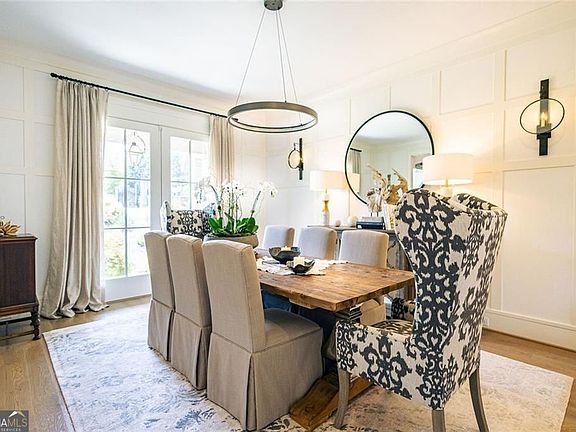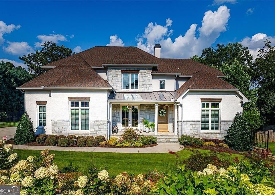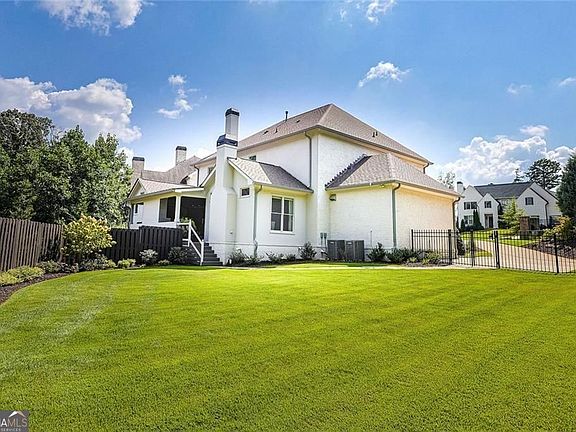 Located in the gated community of Hardin Ridge, in the sought-after Heards Ferry and Riverwood International Charter High School districts. This gorgeous French Country-inspired, modern farmhouse invites with incredible curb appeal and on-trend interiors. A covered front porch prefaces the two-story foyer, which leads to the dining room. Enjoy board-and-batten molding, French doors to the front porch and a butler's pantry offering access to the kitchen. Beautiful hardwood flows seamlessly throughout the main level and all upper-level bedrooms and media room. The fireside family room impresses with lighted built-in floating shelves and lower cabinets flanking the fireplace. The family room has French doors opening to the back covered patio and outdoor kitchen. The gourmet kitchen is outfitted with Thermador appliances, cabinets to the ceiling, an island with seating, quartz countertops and an adjacent vaulted fireside keeping room or breakfast room. Enjoy easy access to the cozy outdoor covered patio which boasts plenty of room for entertaining offering an outdoor kitchen, a fireplace. and overlooks a private fenced yard. Additional details include a magnificent, oversized master on main level w/sitting room, a luxurious master bathroom, 4 upstairs bedrooms with ensuite bathrooms and a media room. The home has two laundry rooms, one up and one down. The finished basement features a theater room with 10 speakers and Dolby Atmos Sound, flanked by a 2nd covered patio. The basement custom bar with cabinetry will contain all that you desire for event entertaining, Lower luxurious full bathroom contains a shower/ steam room. There is also an exercise room and storage galore which is stubbed for a bedroom with an ensuite bathroom. Home also includes fully integrated AV and music in 6 rooms all controlled by 2 wall mounted LED panels, a phone app or 1 of 5 remote controls. Also included is a fully integrated security system including 6 HD/IR external cameras as well as a camera doorbell. Situated on .667 acres on a quiet cul-de-sac, this like new home has everything today's buyer desires. Welcome to life in Hardin Ridge!