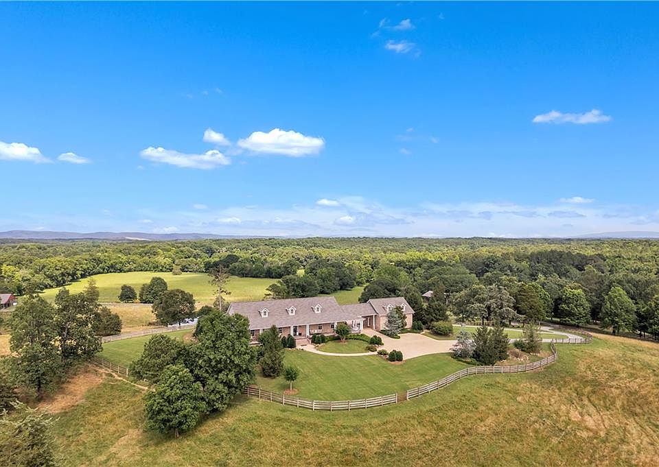 STEP INTO TIMELESS ELEGANCE! This impressive property features a stately front elevation and a beautifully manicured lawn, setting the tone for what’s inside. A welcoming brick front porch with traditional columns and cozy sitting areas invites guests in. This custom-built home offers refined finishes, expansive living spaces, and stunning views from every angle. The main level boasts a light-filled open floor plan with warm hardwood floors, soaring wood-planked ceilings, and a grand stone fireplace anchoring the spacious living room. A dramatic chandelier and full-height windows frame sweeping landscape views, blending indoor luxury with outdoor beauty. The sunroom is a serene retreat that perfectly frames the rolling countryside through expansive picture windows, bringing in natural light and stunning views. Designed for comfort and relaxation, it features wood flooring, neutral walls, and ample space for multiple sitting areas. Whether you’re enjoying a quiet morning coffee or gathering with guests, this bright and inviting space provides a seamless connection to the outdoors while maintaining year-round comfort. The gourmet kitchen is a chef’s dream, featuring richly stained custom cabinetry, granite countertops, a striking tile backsplash, stainless steel appliances, and a large island with bar seating—ideal for both cooking and entertaining. An elegant formal dining room and adjacent sitting area create an inviting setting for gatherings. The oversized primary suite offers a serene retreat with vaulted wood ceilings, private access to the patio, and a spa-inspired ensuite bath. Here you'll find dual vanities with granite countertops, a built-in makeup station, a soaking tub, and a walk-through tile shower with multiple showerheads and a bench. Ample storage, custom built-ins, and designer touches complete the space. Additional guest rooms on the main floor are spacious and thoughtfully appointed, and the guest bathroom is beautifully updated with stylish cabinetry and tile finishes. Also enjoy the ease of electric shades on most of the main floor windows. The finished basement level expands your living and entertaining options with a partial kitchen, large recreation area, media space, game area, private guest suite, and a full bath—perfect for multi-generational living or hosting guests. In the backyard, a luxurious gunite in-ground pool with a raised spa and waterfall feature provides the perfect spot to relax and entertain, all set against panoramic countryside views. The beautifully manicured landscaping and fenced pastures enhance the serene setting, while multiple seating areas and walk-out basement patio add to the home’s functionality and flow.. The spacious driveway includes a breezeway that connects to a detached two-car garage offering even more convenience. Additional parking space in the back ensures plenty of room for guests or multiple vehicles. Tucked away in a peaceful setting just minutes from town, this exceptional property offers the perfect blend of privacy and convenience.