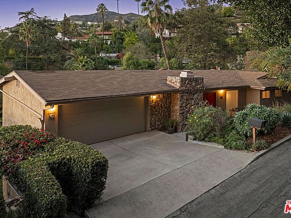 Tucked away in the serene hills of Glendale's coveted Rossmoyne neighborhood, this spacious mid-century home is a light-filled sanctuary with spectacular hillside views. Built in 1965 and mindfully updated, the residence spans two levels, with large windows and sliding glass doors seamlessly bringing the outdoors in. The bright and open living room is anchored by a fireplace; the kitchen with generous storage opens directly to the dining area. Three bedrooms include a primary suite with an en-suite bath; on the lower level, both bedrooms enjoy outdoor access. A bonus den with a wet bar adds flexibility for a media room or creative space, and flow is easy to the large deck, a breezy spot for taking in the stunning vistas and colorful sunsets. Multiple patios create a tranquil setting for relaxing and entertaining amid lush natural surroundings. The great location puts you close to Verdugo Park and vibrant dining and shopping options, including the Americana at Brand and the upcoming Erewhon.