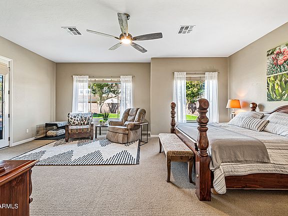 Come and check out this wonderful Fulton home in the popular subdivision of Vintage Ranch in Gilbert! Your visit will show you that this home has been well taken care of by the original owners! It's a split bedroom open floorplan with tons of space, providing four bedrooms PLUS a den. The kitchen features, TONS of raised panel/staggered cabinetry with some of glass inserts and decorative pulls. Stainless steel appliances, pull out faucet, double ovens, new built in microwave, and an updated tile backsplash! Kitchen opens up into the family room, which has new brand carpeting! Throughout the home you will find Faux wood blinds and shutters, Colonist interior doors with lever hardware, 10 Ft flat and volume ceilings, fresh paint inside and out in some areas and neutral coloring! Large Primary suite with sitting area too! Primary bath has an easy access walk in glass shower. Cultured marble Bullnose vanity tops at primary with dual sinks too! Walk in closet, with mirrored closet doors, and private commode room!