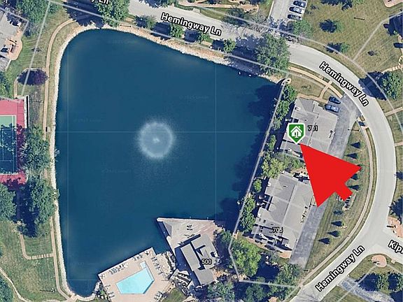Welcome to 702 Hemingway Lane ~ Ground Level Ranch LAKEFRONT Condo in beautiful Chapter One! 1300 SF/2BR/2BA/2-Car Garage! All living areas feature big windows (w/2" wood blinds!) that overlook the complex's lake w/fountain feature! Very nice! Big, Vaulted Great Room with floor-to-ceiling brick WB fireplace and wood storage niche. Hardwoods throughout Great Room and Dining Room. Kitchen features 42" white cabinetry with Silestone counters, nice island with bookshelf, a pantry, and another shelving nook! All kitchen appliances are newer, and refrigerator can stay. Nice Primary Bedroom with comfortable sculptured carpeting, ceiling fan and EXQUISITE bath remodel: Big walk-in shower with custom artisan tile work, double sinks w/storage cabinet between them, adult-height vanities, and extra storage with in-wall medicine cabinet. Big walk-in closet also. Secondary BR has a wall of closet space, sculptured carpeting, and ceiling fan. This home has been completely, lovingly upgraded since 2019 with: New windows and blinds (excellent update!), New HVAC, slider and storm door, sculptured carpet in bedrooms, flooring in the MAIN FLOOR LAUNDRY plus new water shutoff, kitchen backsplash, sink and faucet , COMPLETE remodel of Primary Bath, and everything is updated in hall bath except tub. Large 2-car garage. Come enjoy resort-style living at this LAKEFRONT GEM with great amenities (trails, pickleball courts, manicured grounds, pool, clubhouse, and more!). Call now!