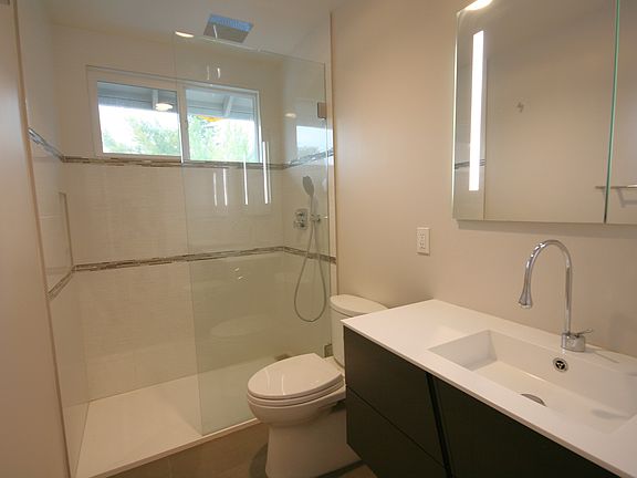 Bathroom: Large Stall Shower with Rain Shower Head (Handheld Combo), Custom Vanity Top with High-End Mirror Custom