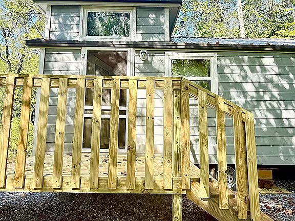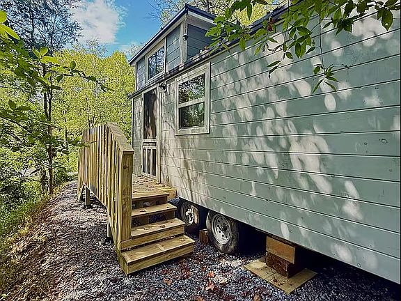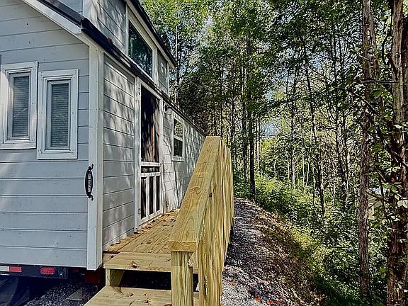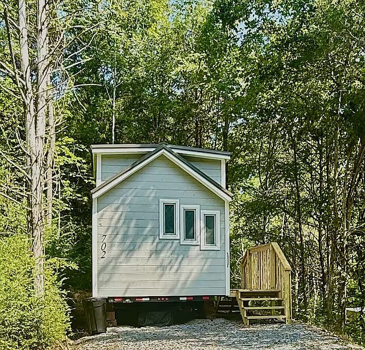 All pine, fully furnished tiny home cabin located in the Incredible Tiny Homes Community (Mountain). This home sits on a wooded lot on the lower part of the mountain- no steep hills.