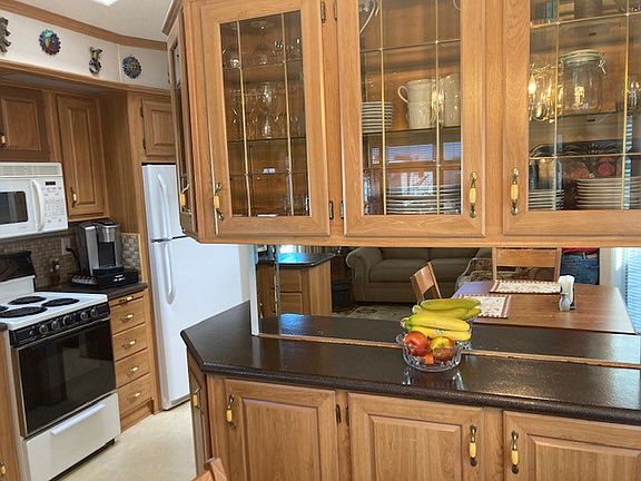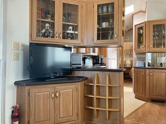 One bed, two bath home with large galley kitchen, newer refrigerator, breakfast nook and Epoxied countertops. Raised ceiling and skylights in the kitchen and bathroom. Wall bed and desk. Arizona room with tile floor. Large shed on back patio with brick pavers.