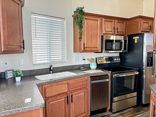 This charming 367 square foot Park Model home in Apache Junction, AZ was built in 2023 by Cavco. Boasting 1 bedroom and 1 bathroom, this cozy abode features a spacious living room, a well-appointed kitchen with stainless steel appliances, a dining room for entertaining, and a convenient carport for parking. Enjoy the Arizona sunshine on the patio or store your outdoor gear in the included shed. With modern amenities such as central A/C, a hot water heater, and a dishwasher, this home offers comfort and convenience in a compact space. Located in the sought-after community of Superstition Sunrise, residents of this park model home can take advantage of numerous amenities such as a clubhouse, swimming pool, fitness center, and planned activities. Enjoy the stunning mountain views and desert landscape while taking a leisurely walk around the neighborhood or relaxing with neighbors in one of the communal gathering spaces. With easy access to shopping, dining, and outdoor recreation, this active adult community provides the perfect setting for those looking to enjoy retirement in the Arizona sunshine.
