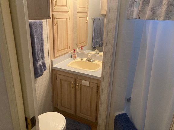 This Home Features a new Roof in 2021 and a raised deck out front. Covered patio. Peaked ceiling. Lots of storage in AZ room. Full Size w/d. 1.5 bath. Pull out couch in AZ room Light cabinetry t/oTub shower combo. Galley kitchen with wrap around hutch. Full size w/d in AZ room