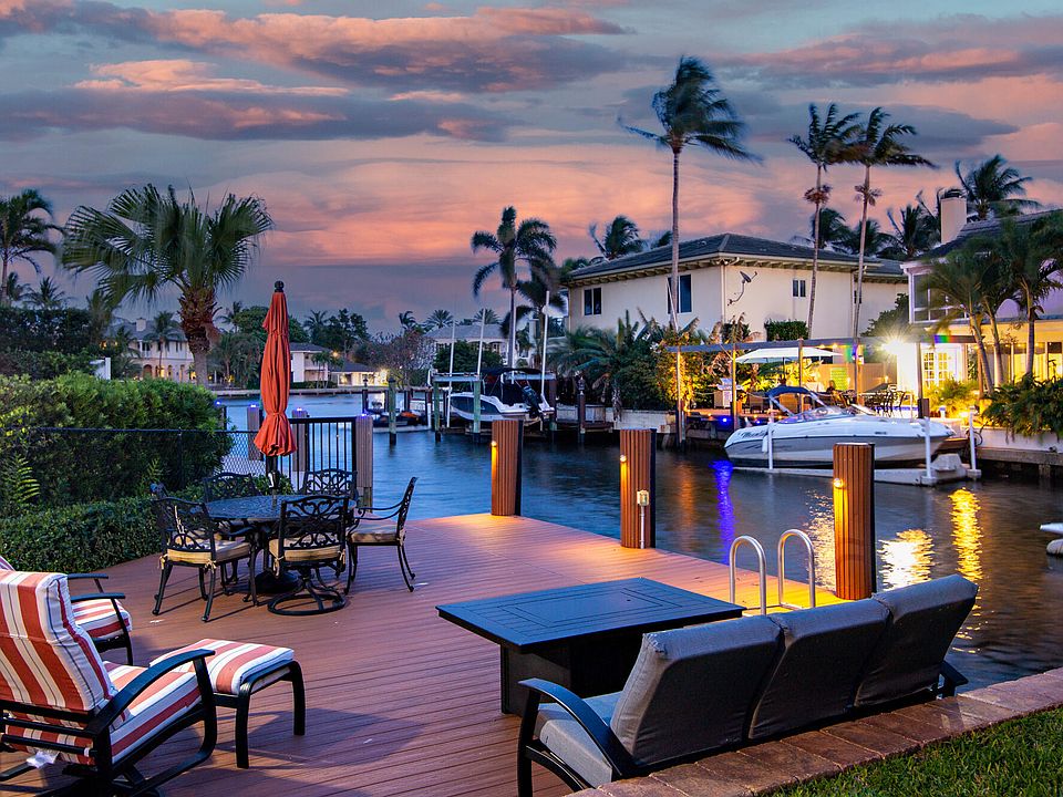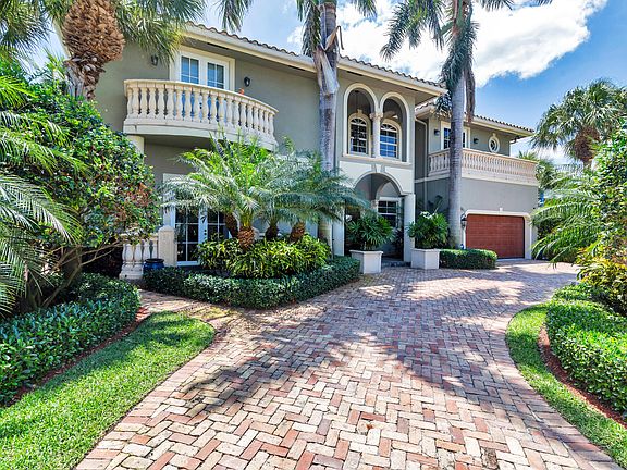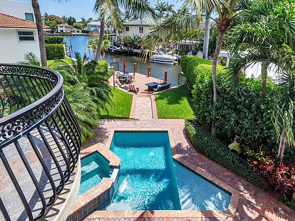 Waterfront home near Atlantic Ave. Built in 2006, this 4-bedroom, 3-bath, plus cabana bath home offers 4,400 sqft of living space. Enjoy 31 ft of pristine water frontage with a 2023 renovated dock & seawall, ideal for sunset views. The serene gated backyard features a heated pool & jacuzzi, perfect for entertaining. The lower floor has an open layout connecting the living room & kitchen to the outdoor space, plus a guest bedroom & bath. Upstairs, double doors lead to an elegant primary suite with a walk-in closet, large bath, jacuzzi tub & shower and a versatile flex space for office or gym. Upstairs bedrooms open to a charming balcony. Impact windows & doors, 2-car garage, marble & hardwood floors. Come by boat, golf cart or car, but don't miss the opportunity to make this your new home