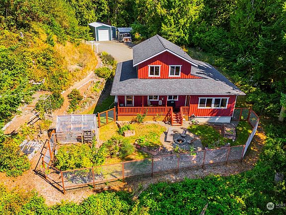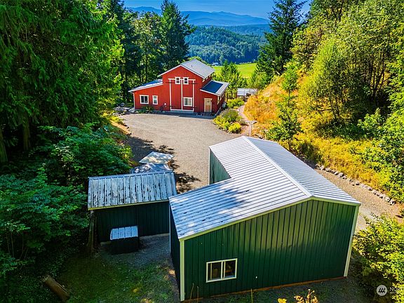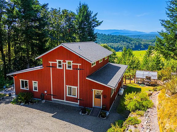 With views of the Olympic Mtns & Chimacum Valley, this stunning barn-style home is PNW at its finest. Enter into a spacious living area w/ maximized views & french doors to a covered deck for rest & gathering. Light-filled kitchen & dining w/ french doors to west-facing deck. Main level bedroom + spacious office/guest room. Upstairs, enjoy an oversized primary suite w/ walk-in closet, full bath & WOW-factor views! On over 5 private acres, this property boasts abundant landscaping, trails, raised gardens, flower beds, orchard, firepits & a park-like sitting area to fully enjoy your beautiful surroundings & views. Outbuildings offer plenty of add'l storage, RV parking, work space & more. New roof 2023. This immaculate home is waiting for you!