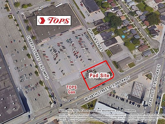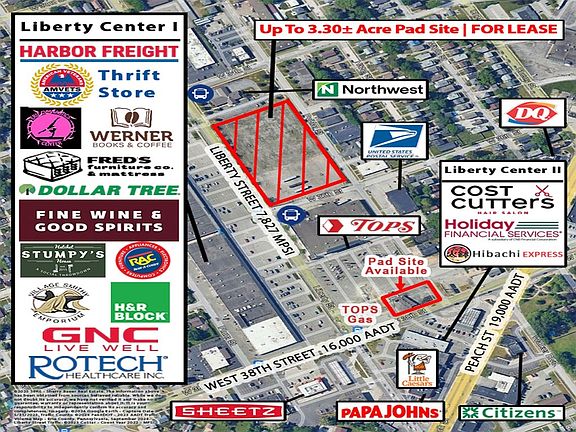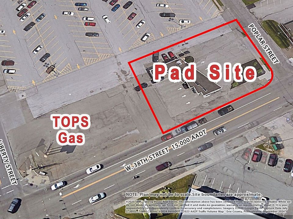 10,000± SF outparcel pad side available for lease at Liberty Center I. Corner lot at W. 38th Street & Poplar Street - just west of Peach Street. Site is an out parcel of Tops Friendly Markets and is contiguous with the new Tops Gas Station. Former 506± SF bank facility with 5 drive-thru lanes - built in 1986. Approximately 145’ frontage along W. 38th Street with 16,000 average daily traffic (PennDOT AADT 2023 count year). Approximately 69’ frontage along Poplar Street. Public utilities on-site. Zoned C-2, General Commercial District. Part of Liberty Center I, a 229,805± SF retail center. Join Tops Friendly Market & Gas Station, AMVETS Thrift Store, Dollar Tree, GNC, Harbor Freight Tools & more. LERTA tax incentive program available offering 80-100% tax abatement on improvements for 10 years. Offered at $4,500/month – NNN ($54,000/Year – NNN). CAM & insurance approximately $1.87SF/YR (based on 2024). Taxes approximately $0.95/SF/YR (based on 2024).