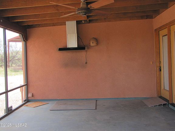 Near the foothills of the Dragoon Mountains! This custom-built 2BR/2Ba stucco home is on 10 fenced acres. Custom doors and cabinets throughout. Both BR have a bathroom, walk-in closet and door onto screened side patio. Open floor plan with exposed beam construction. Dining area has built-in hutch; kitchen has built-in rack for glassware above island/breakfast bar & pantry. Door leading from dining room outside toward carport. Laundry room next to kitchen has W/D, shelving and a window. Front patio, outside LR, is also screened. Outdoor fireplace & covered outdoor spot for BBQ. Hot tub just off the side patio (sold as-is). Large 20x30 metal shed; additional shed holds pressure tank for 3000 gal tank holding hauled water. Covered RV parking w/full hook-up. Located 4 miles from Sunsites.
