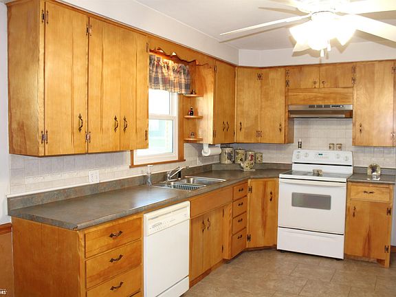 Corner lotLarge windowsCeramic tile backsplashStorage shedsMain floor laundry roomEat-in kitchenBeautiful wood cabinets