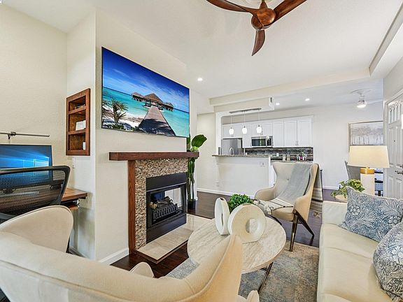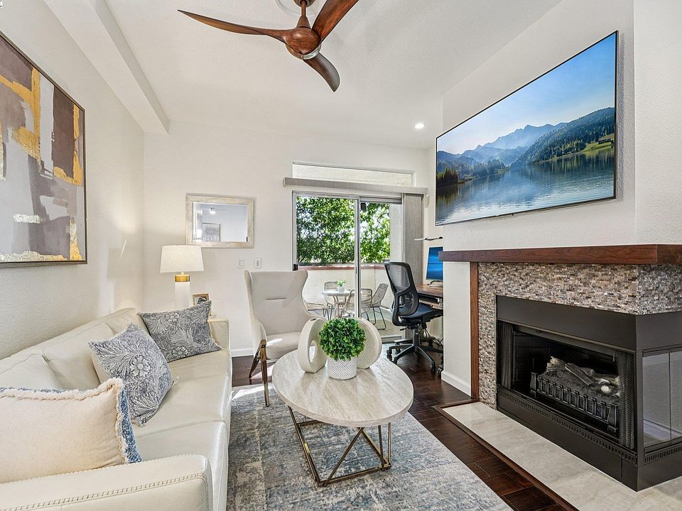 Private and serene, this Mediterranean-style beauty blends comfort with modern flair. Enjoy stunning skyline sunset views from your spacious outdoor patio—perfect for relaxing or entertaining. This desirable lower-level, corner end-unit features wood floors throughout, an open living area, and a beautifully updated kitchen with granite countertops, new cabinetry, and stainless steel appliances. The primary suite boasts a generous walk-in closet, and the convenience of in-unit laundry adds to the ease of everyday living. Includes a dedicated covered end parking stall directly in front of the unit, plus ample guest parking. Prime location within the complex and close proximity to BART, 580/680 freeways, shopping, dining, and local activities. HOA amenities include a clubhouse, BBQ area, volleyball court, and two sparkling swimming pools. A true 10+—don’t miss this opportunity to live in a vibrant and welcoming community! Open house 1 to 4 pm SAT & SUN