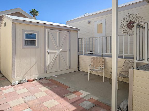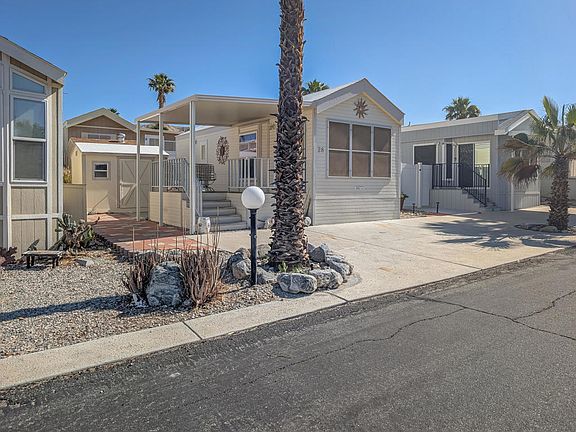 Pride of ownership in this charming and serene home. Close to the Clubhouse and central to all the amenities and activities this pristine resort has to offer. Perfect vacation getaway in the sun or full-time desert oasis in this efficient, and well maintained 2004 Cavco Park Model and features ~400 sq. ft. 1 bedroom, 1 bath. Capture the sweeping views and magnificent scenery of the local desert hills and stunning Mt. San Jacinto while sitting on your covered deck or enjoy the quant and quiet courtyard on the side of the home with a large shed, the roof has been recently white coated, and home comes furnished. This gem is in the luxurious Caliente Springs 55+ Resort and offers top notch amenities to soothe your every desire including mineral hot spring fed pool and spas, fitness center, 9-hole golf course, 8-pickleball courts, tennis courts, full laundry facilities, library, chapel services all in a fun and active community. Bring offers, make new friends, and call this home. Lot is not owned; space rent is $671.