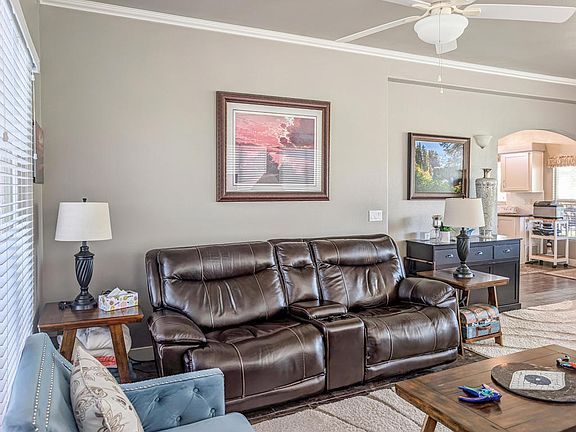 This property offers impressive views both indoors and outdoors and is situated adjacent to the 5th and 6th holes of the golf course. Well maintained, this approximately 750 sq. ft. one-bedroom (king-size), one-bathroom 2016 Cavco Park Model reflects careful ownership. Features include modern appliances such as a robotic vacuum system and two air purifiers, an open floor plan, Luxury Vinyl Plank flooring throughout, mature irrigated landscaping, and a well-constructed California room overlooking the surrounding area. The outdoor space includes two-tiered decking designed for entertaining or relaxation. Inside, the high-volume ceilings and 9-foot doors in the bathroom and bedroom create a spacious atmosphere. Caliente Springs is a 55+ luxury resort community offering amenities including a mineral-fed hot spring pool and spas, a 9-hole golf course, water ball, water aerobics classes, yoga, 8-pickleball courts, tennis courts, and more within an active environment. Please note, the lot is not owned; space rent is $950. Golf Cart for sale not included in price.