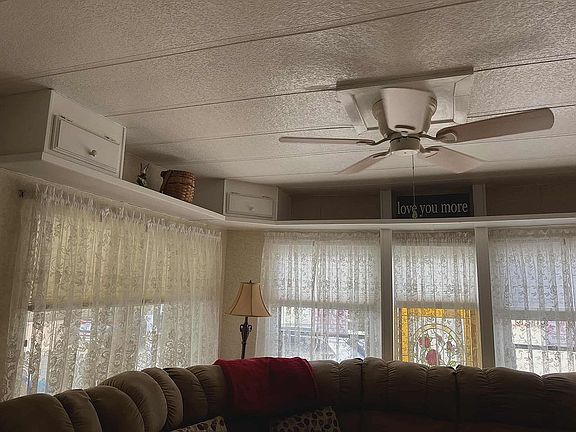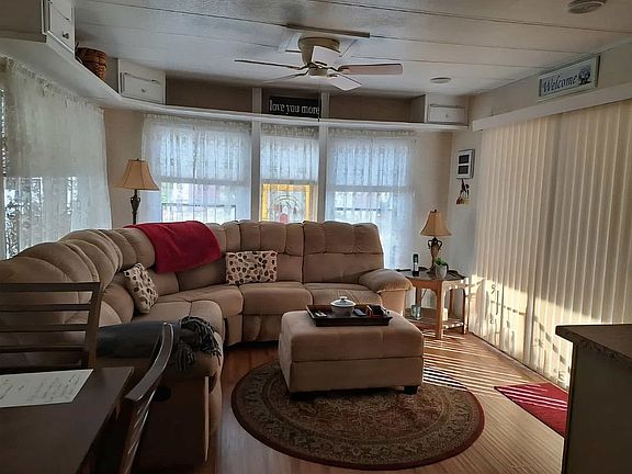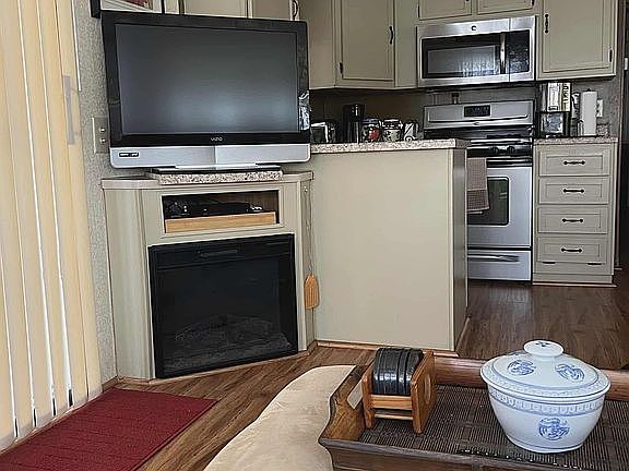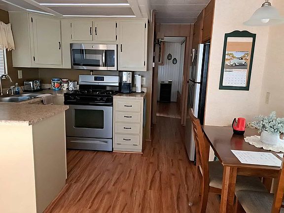 Our beautifully loved and well-maintained 1986 Park Model Nomad mobile home is located in a peaceful, gated 55-plus community Membership Park and offers comfort, charm, and convenience throughout. This one-bedroom unit features two closets and a queen-size Murphy bed with abundant storage, along with a full bathroom that includes a bathtub, shower, and additional storage space. A small office nook with a printer provides a practical workspace, while the spacious front room offers a cozy sectional and an inviting electric fireplace. The kitchen boasts custom cupboards, laminate countertops, and all appliances, and the home comes completely furnished with sheets, dishes, and glasses. Outside, the property is fully cemented and enhanced with electric lighting around the awning, an electric lamppost, and a large, well-organized storage shed. Centrally located within the community, it offers quick access to the laundry facilities, pool, hot tubs, clubhouse, library, office, and trash area.