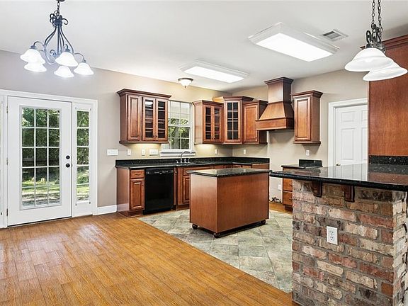 Custom cabinetryFunctional layoutBackyard patioGranite countertopsCovered front porchWood-look ceramic tile flooring