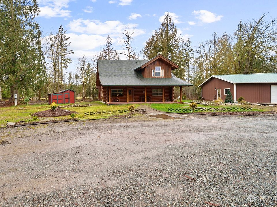 Beautiful and picturesque Rocky Mountain log home on a secluded 5 acre lot. Live in your own storybook, the interior is warm and quaint with soaring ceilings, open kitchen and views out every window. Main floor has 1 bd and full bath with jetted soaking tub. Upstairs is a loft area for office/bonus room with large primary bedroom and en suite bath. Covered porch to enjoy your oasis. Dry rock bed landscaping, and plenty of room for your vision!! Farm life, gardening, so many possibilities. Huge garage/shop w room for parking and large shop space. So many options for all your toys & RV hook up. Septic is a 3 bedroom so there is a possibility to add on (buyer to verify).