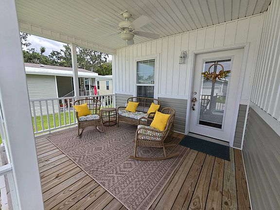 This beautiful 2024 Champion home is thoughtfully designed and lightly lived in. Nestled in the highly sought-after Oaks at Colony Cove, a serene 55+ community, this 2-bedroom, 2-bathroom residence offers an inviting open-concept layout with luxury vinyl plank flooring throughout. The spacious, eat-in chef's kitchen is equipped with stainless steel appliances, recessed lighting, and custom cabinetry that flows seamlessly into the bright living area featuring a tray ceiling and abundant windows-creating a comfortable space perfect for entertaining. The oversized primary suite boasts a large walk-in closet and a luxury ensuite bathroom with dual sinks and a fully tiled walk-in shower. A second bedroom at the front of the home with its own modern full bathroom provides comfort and privacy for family and guests. Additional highlights include a laundry room off the kitchen with a separate entry to the carport, plus a detached shed for extra storage. The large, welcoming front porch is ideal for enjoying peaceful mornings or relaxing evenings with friends and family. Positioned at the end of a quiet dead-end street, the home offers a long driveway for both privacy and ample parking. The gated community features its own pool, while residents also enjoy access to Colony Cove's impressive amenities-six heated pools, five clubhouses, pickleball and tennis courts, a marina with fishing pier, a fun bus for community outings, and close proximity to the pristine Gulf beaches of Anna Maria Island, just 16 miles away. With convenient access to Tampa, Sarasota-Bradenton, and Clearwater-St. Pete airports, this home offers comfort, convenience, and a vibrant lifestyle, making it a wonderful opportunity to experience Florida living at its finest.