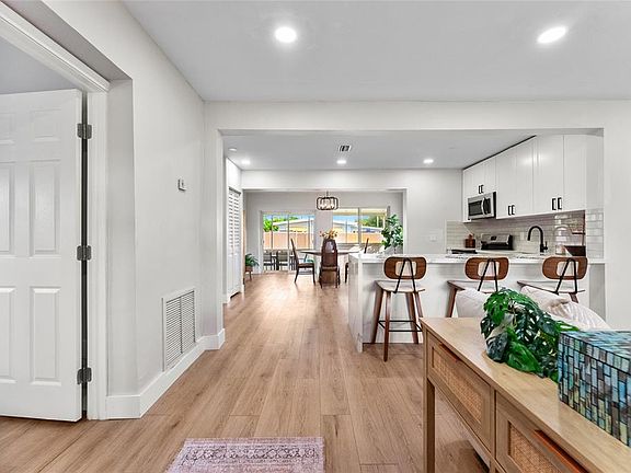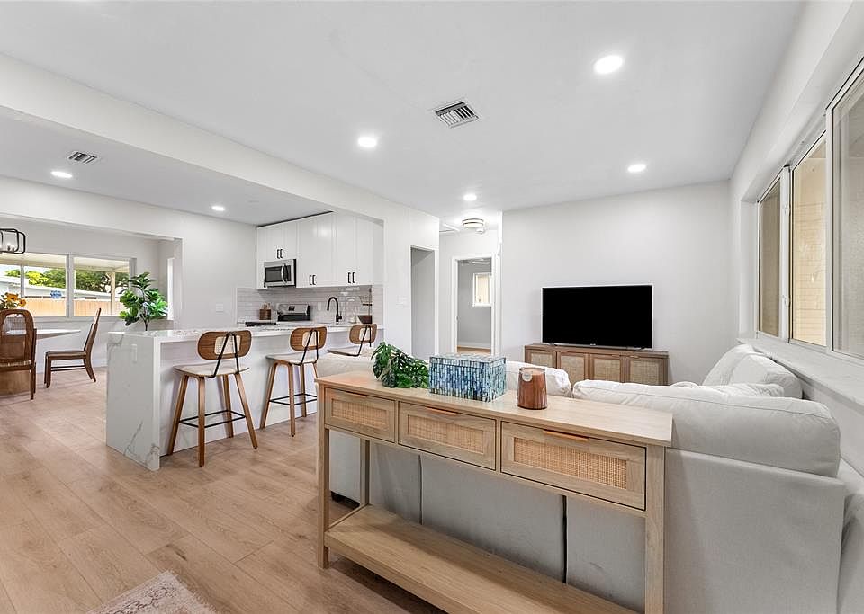 Fully renovated and move-in ready! This bright, open-concept home features a new kitchen with shaker cabinets, quartz countertops, stainless steel appliances, and a large peninsula with seating. Enjoy a seamless flow from the kitchen to the living and dining areas—perfect for entertaining. Modern finishes throughout include luxury vinyl flooring, updated lighting, and a stunning bathroom with a walk-in shower and illuminated mirror. The spacious covered patio overlooks a large fenced yard with a fire pit and with plenty of room for a pool. New roof, impact windows, and updated systems add peace of mind. Conveniently located near shops, schools, restaurants, and major highways!