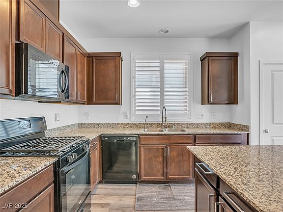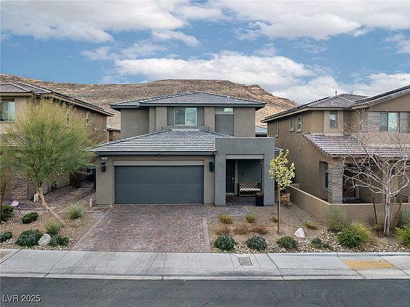 Don't miss this beautiful home in the gated Jade Ridge community of Summerlin South! This exceptional 3-bedroom, 2.5-bathroom residence blends modern sophistication with comfort, offering stunning mountain views from both the private balcony and the backyard. Inside, you'll enjoy an open-concept floor plan with brand new tile flooring throughout, a spacious kitchen with granite countertops, stainless steel appliances, custom cabinetry, an island, and ample storage space. Upstairs, the primary suite is a true retreat, featuring its own balcony and a generous walk-in closet. The home includes stylish shutters and window coverings throughout for maximum privacy. The low-maintenance backyard is designed for relaxation, featuring a paved patio with a covered area, turf, and raised garden beds. Additional highlights include a tankless water heater for enhanced efficiency and comfort, plus garage storage and shelving for added convenience.