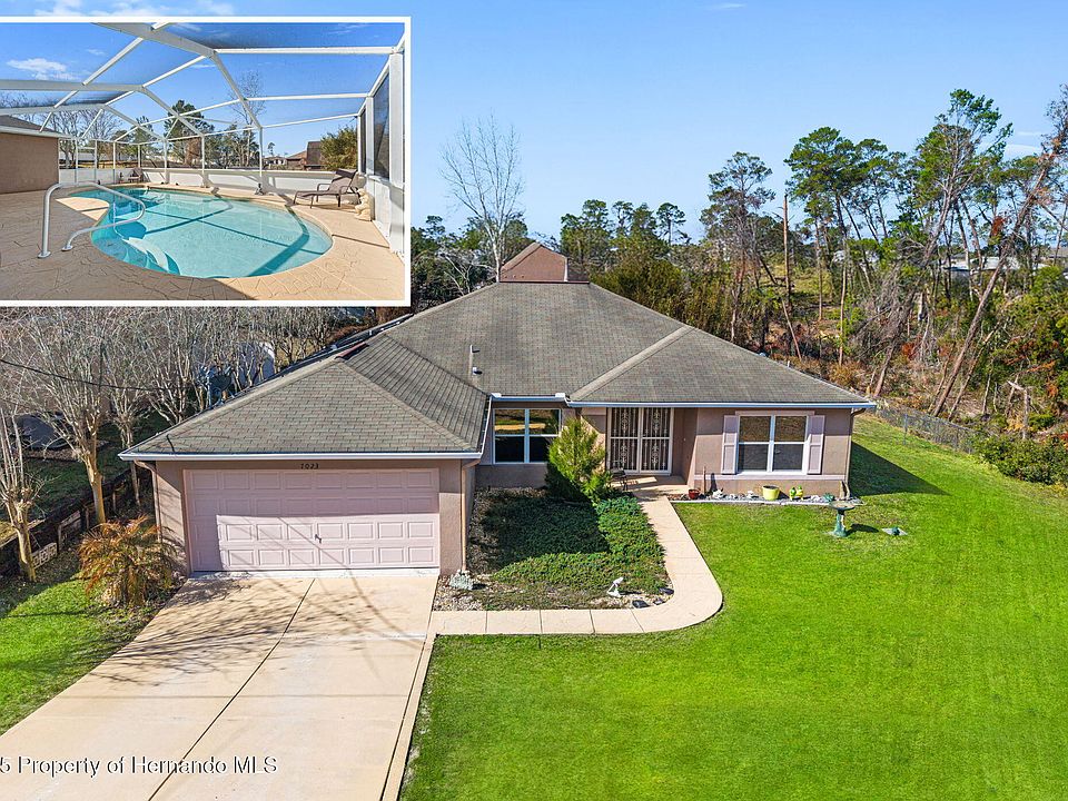 Active under contract accepting backup offers TWO PRIMARY SUITES & A POOL? YES, PLEASE! Looking for space, flexibility, and a private backyard oasis? This 4-BEDROOM, 3-BATHROOM +DEN/HOME OFFICE home sits on a HALF ACRE LOT and has something for everyone. Step inside to discover a unique layout featuring TWO PRIMARY SUITES. The main suite boasts his & hers walk-in closets, double sinks, and a large walk-in shower. The second suite has its own full bath, walk-in closet, and PRIVATE ENTRANCE, making it perfect for guests or multi-generational living.  Love to entertain? The screen-enclosed in-ground pool with a huge covered lanai is ready for summer fun. The kitchen shines with granite countertops and new appliances (2022), plus a new washer & dryer (2024). Need more space? The den can be a home office or even a 5th BEDROOM! Outside, the cross-fenced yard offers privacy, and the seller is installing a BRAND-NEW ROOF before closing. Plus, the new AC (2018) and plantation shutters add to the appeal. NO FLOOD ZONE OR HOA! Call today - you will want to see this one in person.