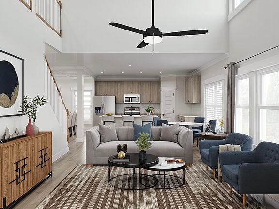 The Laurel. From the beautifully appointed exterior with bay windows, enter the 2-story foyer. The dining room with its coffered ceiling opens conveniently to the eat in kitchen and flows seamlessly into the dramatic 2 story family room with fireplace. Enjoy all the natural light cascading inside from the multitude of windows across the back of your home. As you make your way upstairs you experience the spaciousness of the home design. The primary suite is complete with a separate sitting area featuring bay windows, a trey ceiling in the bedroom & the perfect bathroom to relax & rejuvenate. The 2nd floor has 3 additional bedrooms, 2 full baths & loft. An office/bonus room is located off the foyer and has private access to downstairs full bathroom. Covered porch, 3 car garage. Brand new plan!