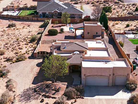 Stunning home in Rio Rancho Estates offering over 3,200 sq ft of beautifully designed living space including a charming main house, an inviting guest/pool house, and a finished sound proof basement. The Southwest-style main house features classic vigas, a cozy kiva fireplace, a bright open great room, a split wing floorplan, and a gourmet kitchen perfect for entertaining. The finished basement provides additional versatile living space. The guest/pool house boasts a huge swing-open window overlooking the expansive patio and large heated pool, which includes an automatic cover. Situated on a fully landscaped half-acre lot with incredible views, this property also includes an oversized 3-car garage and RV parkinga"everything you need for comfort, space, and style in the heart of the desert.
