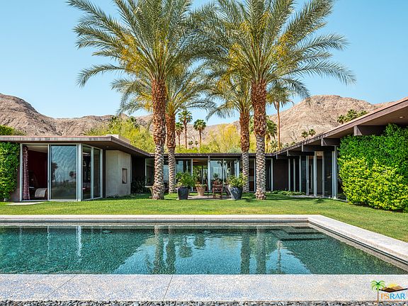 1960's mid century house rebuilt and reborn in 2006 with an architect led renovation creating an incredible juxtaposition of post and beam architecture and contemporary details with core 10 steel facades. Fleetwood doors and windows allow light to flood the wide open floor plan with huge kitchen, dining and sitting area as well as a second separate dining room and sitting area. These two large communal spaces nicely connect the 5 oversized en-suite bedrooms. The master bedroom has expansive glass sliders and tremendous views of both the valley floor and the mountain cove of Thunderbird. Incredible landscape with large trees and gracious pool make this a genuine residence or the ultimate vacation home. This is truly one of the most unique offerings on the market today.