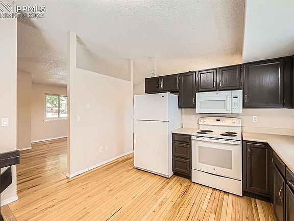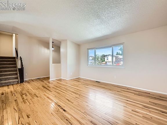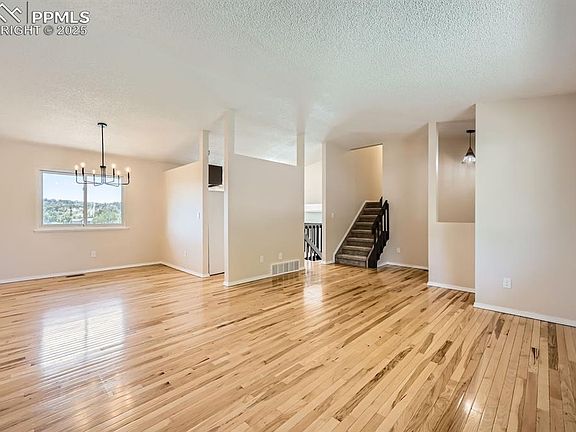 Freshly painted interior, exterior and deck. New carpet with an upgraded pad throughout the home. New light fixtures, outlets and switches. Hardwood floors on the main level. Amazing views of Pikes Peak from the deck. D20 schools. Roof is 2 years old. Home has been professionally cleaned. Very quiet area in a convenient location!
