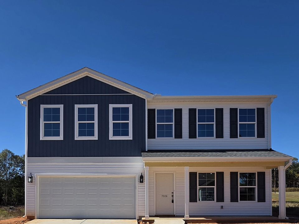 READY IN NOVEMBER! This home will impress you from the moment you see its modern white vinyl exterior with blue accents. You can easily envision yourself sitting on the large front porch. Upon entering, you will find a spacious family room that is perfect for entertaining family and friends. The upgraded kitchen features stainless steel gas appliances, shaker-style white cabinetry, and granite countertops. At the back of the home, there is a versatile flex room that can serve as a home office or playroom. The windows allow for great natural light and offer glimpses of the wooded backyard, which is over half an acre. Upstairs, there is plenty of space to spread out, with a spacious loft ideal for movie nights and three secondary bedrooms that provide ample storage. The primary suite is equally impressive, boasting plenty of closet space, quartz countertops with dual sinks, and a five-foot shower. Come see this wonderful home today in Fairview Falls!