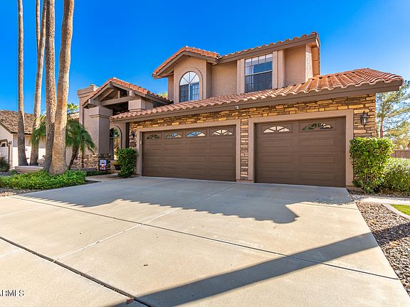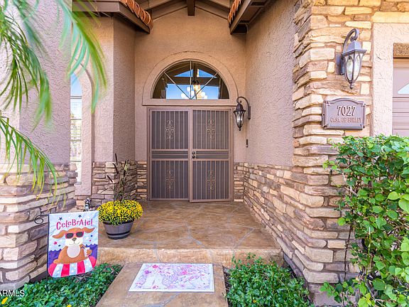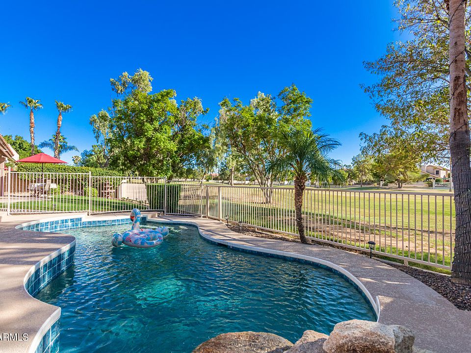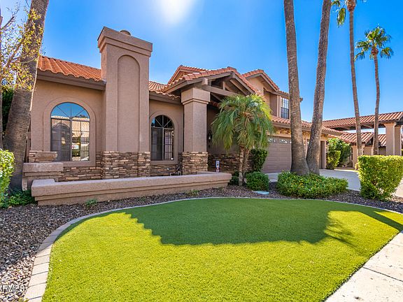 RESORT-STYLE LIVING!! This spectacular 4 bed, 2.5 bath two-story home in the desirable Arrowhead Ranch is a dream come true! Nestled on a golf course lot displaying a 3 car garage w/built-in cabinets, lovely stone accents, and a carefully landscaped front yard w/artificial turf. Enter through the custom double doors to be greeted by a perfectly flowing living & dining room! You'll love the two cozy fireplaces, trending custom paint, tons of natural light, tile floors w/carpet in all the right places, and vaulted ceilings that add to the airy feel. Enjoy the family room with a wet bar and French doors that merge the inside & outside activities! The gourmet kitchen boasts high-end SS appliances, granite counters & backsplash, plenty of cabinets, a center island, and a bright breakfast area. Primary bedroom is downstairs providing extra privacy! It has access to the back and a lavish ensuite with a separate tub/shower, dual sinks, & a walk-in closet. Head upstairs to find a cozy loft, laundry room, and other bedrooms. Check out the entertainer's backyard offering a relaxing covered patio, built-in BBQ, a lush lawn, a sparkling fenced pool, and a view fence overlooking the delightful golf course!
