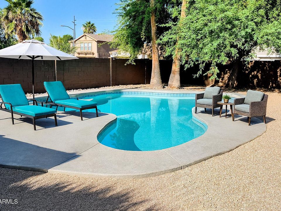 Packaged so well and packed with so much this unique home has so much to offer! In an era of no backyards this has an extra-large one, with the home perfectly positioned near the center—providing plenty of space between only 2 neighbors. Surrounded by trimmed Mesquite trees providing shade, privacy, and nature. Enjoy finished block walls, charming outdoor lighting, and a saltwater/heated pool with extended decking—perfect for healthy swimming and beating the heat!. Inside, you'll find large tile flooring, upgraded black hardware throughout. North/south facing, near downtown, lovely parks and walking areas near by! Freshly trimmed palm trees and mesquite trees add to the charm of this home. Home has the pool, mature trees, large yards, gates! Ready for new owner!!