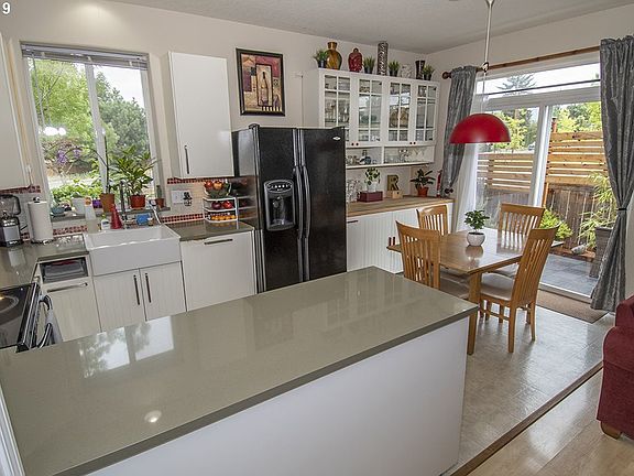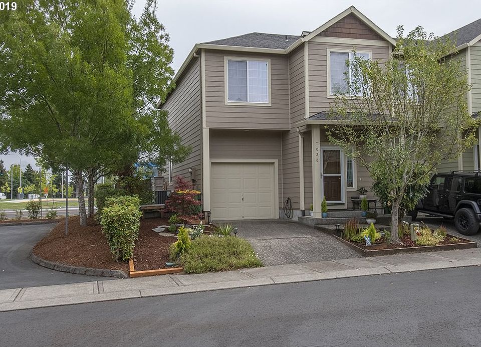 Stylish end unit with Dream Kitchen-Quartz counters, modern cabinetry, hutch with butcher block counter. Great room style with cozy corner fireplace, laminate floors, dining opens with slider to lushly landscaped zen oasis of a fenced patio. All appliances included. Vaulted master with walk-in and double sinks in ensuite bath. Oversized one-car garage with ample overhead storage. Move in ready.