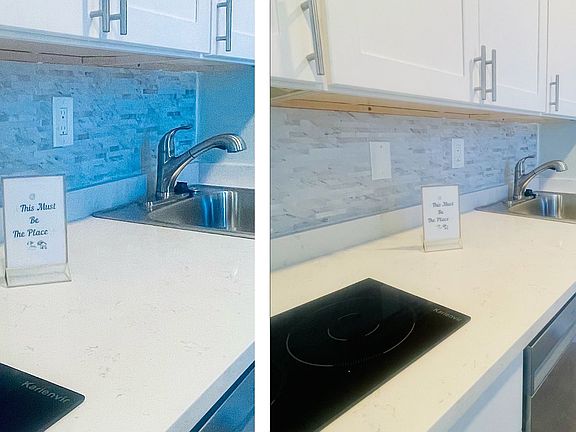 - Fully Equipped Kitchen & Living Area: With a modern quartz countertop kitchen with dishwasher, refrigerator, cooktop, microwave/air fryer, and coffee maker. Spacious cabinets with cookware, utensils, and a designated pantry space.