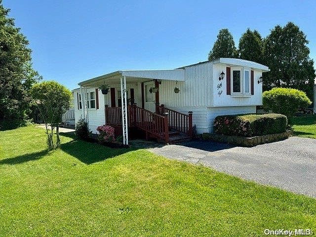 Welcome to Calverton Meadows, an active 55+ community. Enjoy your morning coffee on the covered front porch of this Ranch home which offers 2 bedrooms, a recently updated full bath with a tub and double sink, an eat-in-kitchen with bay window, dishwasher and ceiling fan, separate dining area with coffee bar and nice sized living room with built in shelving and ac wall unit. Master bedroom with overhead cabinets storage, ceiling fan plus ac wall unit, brand new flooring and closet doors. Second bedroom also with overhead cabinet storage and ceiling fan. Two car wide driveway parking. Room for stackable Washer/dryer. Barn style shed for additional storage. Patio area for outdoor barbeque grilling, vegetable or flower plantings, or simply relaxing in the sun. $886/month fee includes Land Lease, TAXES, Water, Trash and Septic Maintenance. Snow removal of street only. There is no HOA fee. Calverton Meadows includes clubhouse with exercise room, pool table, and ping pong. Clubhouse is also free to reserve for residents. This home is land lease. There are no HOA fees. Active over 55 community. You own the home and lease the land. You will not be disappointed in this community! Pack your bags, ready to move in!