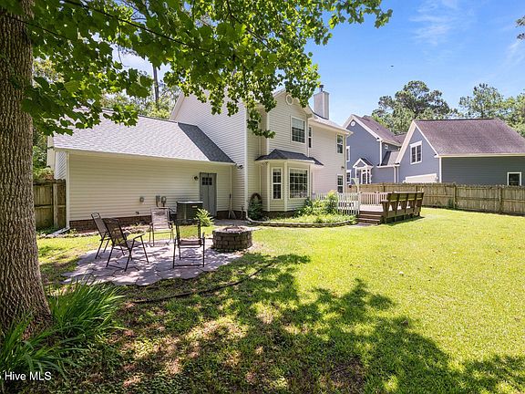 Welcome to this lovely home with fenced-in back yard located in the desirable Stonebridge Landing neighborhood that includes sidewalks. The front porch is great for sitting and extends the width of the home. When you enter the tiled foyer, there is a flex space to your left that can be a family room, home office, workout room or playroom. To your right is the formal dining room with chair rail accent. There is a half bath and generous closets downstairs. Kitchen has a nice nook with bay window to overlook the private back yard when having morning beverages. All appliances convey. Living room has fireplace and a view of the back yard. Private back yard includes a deck and fire pit to relax and entertain family and friends. Upstairs are the principal suite, two additional bedrooms hall bath and laundry room. All rooms and are spacious. Attic access is through the principal bedroom closet. Water heater May 2025, HVAC Oct 2024. Convenient to MCAS, Cherry Point, historic downtown New Bern as well as the beautiful beaches of the Crystal Coast.