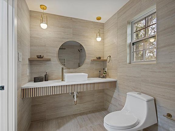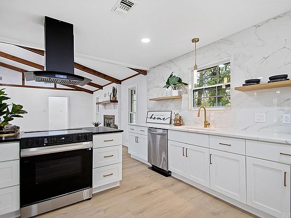 Welcome home to this stunning, fully remodeled retreat in the heart of Sherwood! Nestled at the end of a peaceful dead-end street, this 3-bedroom, 2-bath modern ranch perfectly blends warmth and sophistication. Step inside to soaring vaulted ceilings with exposed beams, an open-concept living area, and a cozy fireplace that anchors the space. The designer kitchen features sleek cabinetry, quartz countertops, stainless steel appliances, and a statement island—ideal for entertaining. The spacious primary suite offers patio access, a walk-in closet, and a luxurious ensuite with a custom floating vanity and spa-style shower. Both bathrooms showcase high-end finishes with gold fixtures and elegant tile. There is also a formal dining room for entertaining and a huge laundry room to contain the day to day laundry and storage for holiday items. Enjoy a large backyard framed by mature trees with an oversized concrete patio —perfect for gatherings or quiet mornings with coffee.