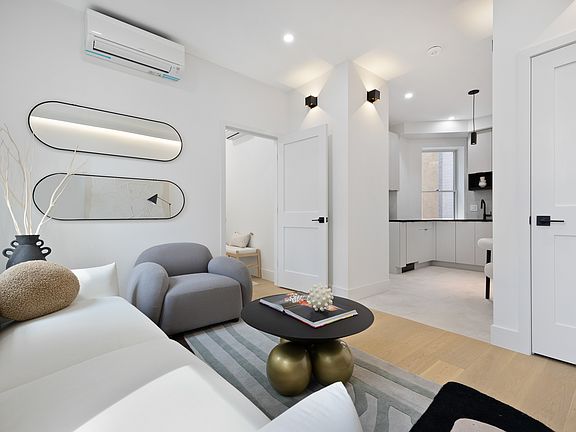 The apartments feature brand-new, top-notch finishes and state-of-the-art appliances. The kitchen has ample cabinet space and an integrated fridge, freezer, and dishwasher, with room for a four-seater dining table or an island. The living room is beautiful, with two windows providing abundant natural light and accommodating your three-seater or sectional sofa. Both bedrooms fit queen beds and have great natural light. All of the apartments have central air and heating. The building has laundry facilities and a stunning, massive courtyard with Wi-Fi access. Storage units are available and are included in the rent!