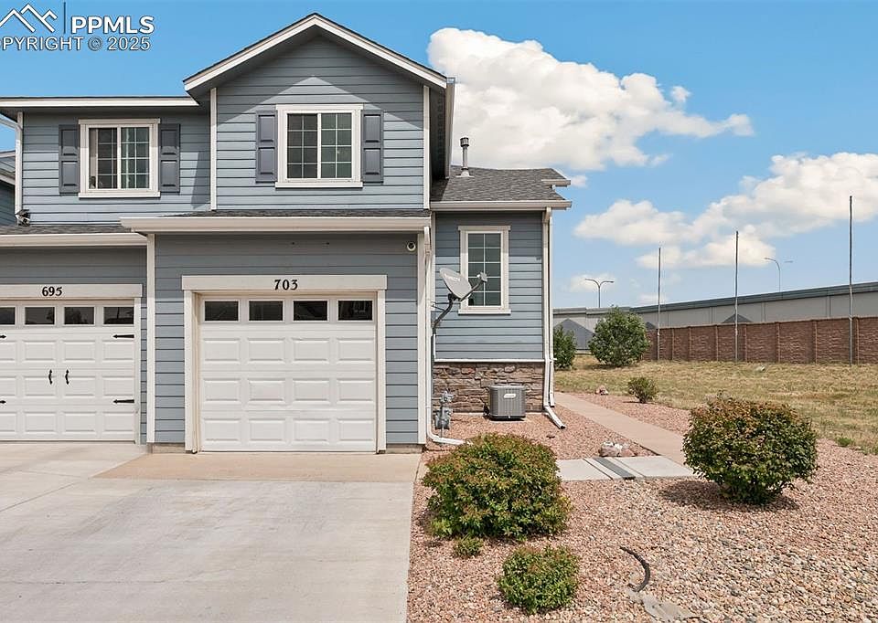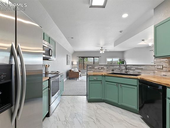 This spacious 3-bedroom, 2.5-bath end-unit townhome offers the perfect blend of style, comfort, and convenience. Step inside to a welcoming entryway with new tile flooring, leading to an open floor plan on the main level that seamlessly connects the large living room and dining area. The modern kitchen features beautiful butcher block countertops, stainless steel appliances, and ample cabinetry for storage. Upstairs, the primary suite boasts a walk-in closet and a 5-piece ensuite bath, while the other bedrooms share an updated full bathroom. Additional updates include stylish ceiling lights and fans throughout, plus central air conditioning for year-round comfort. Enjoy the outdoors from your private, fenced back patio or take advantage of being just steps from the Sand Creek Trailhead. A 1-car garage adds convenience and storage. Perfectly situated, you’re 15 minutes from Peterson Space Force Base and Colorado Springs Airport, 20 minutes from Fort Carson, and just minutes from Powers Blvd for an easy commute north or south.